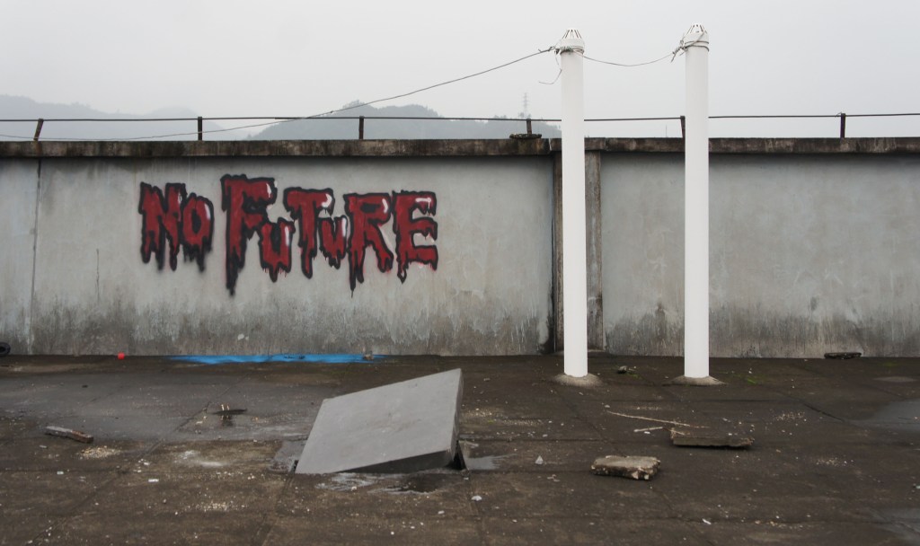 A pavement block on a spring, placed on the rooftop of our dormitory in Jingdezhen. One night, one of the students (I assume) made the graffiti in the background, which echoed my own feelings.